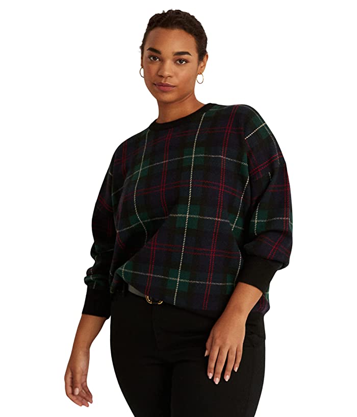 Ralph Lauren Women’s Black Ribbed Boxy Fit Dropped Shoulder Plaid Long Sleeve Crew Neck Sweater (Plus 2X)