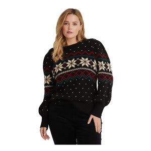 Lauren Ralph Lauren Women’s Black Ribbed Printed Pouf Sleeve Crew Neck Sweater (Plus 3X)