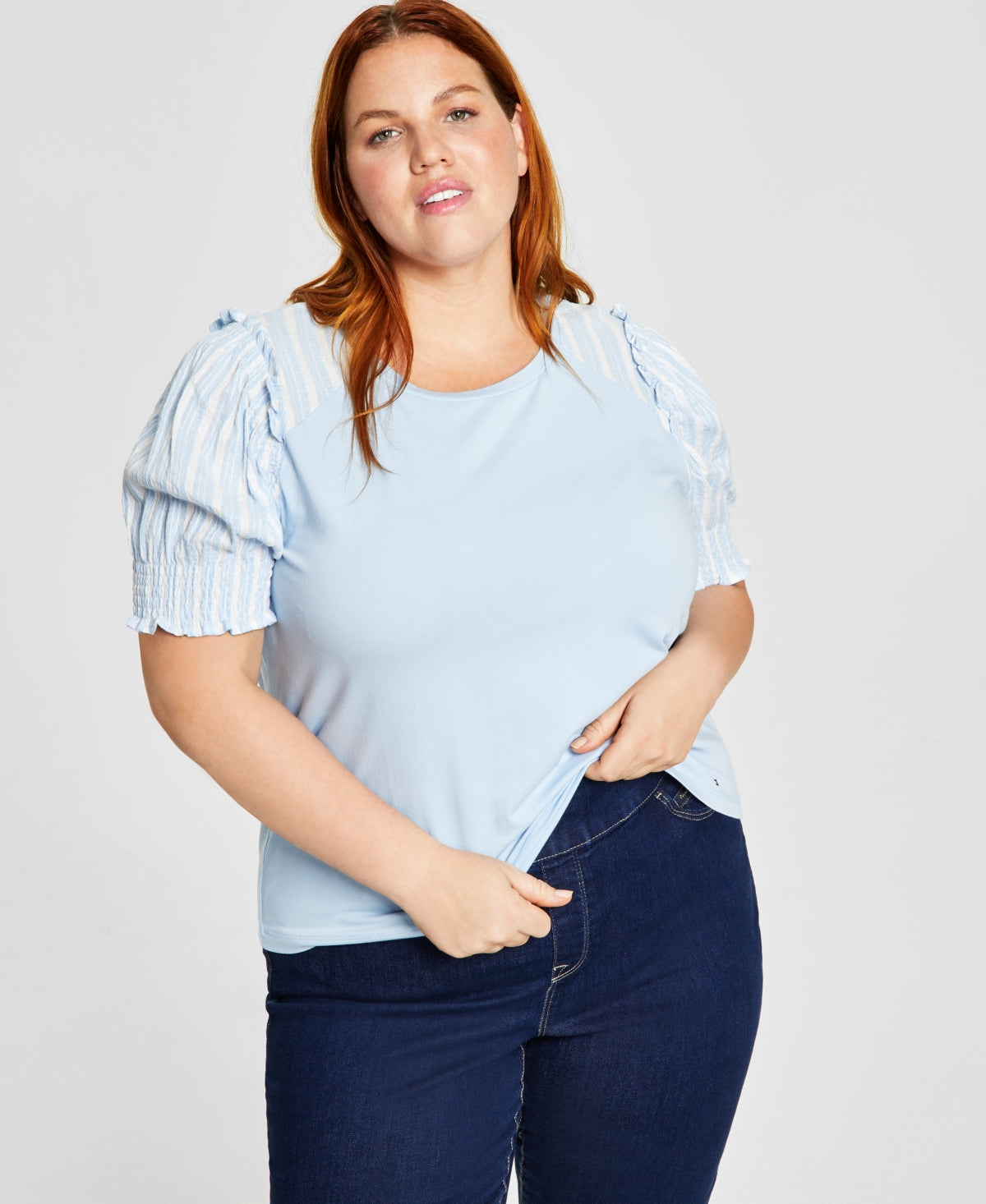 Tommy Hilfiger Women’s Light Blue Smocked Short Sleeve Crew Neck Top (Plus 1X)
