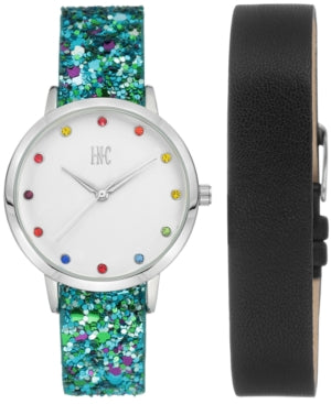 I.N.C. Women’s Blue Glitter & Black Faux Leather Interchangeable Strap Watch – 36mm